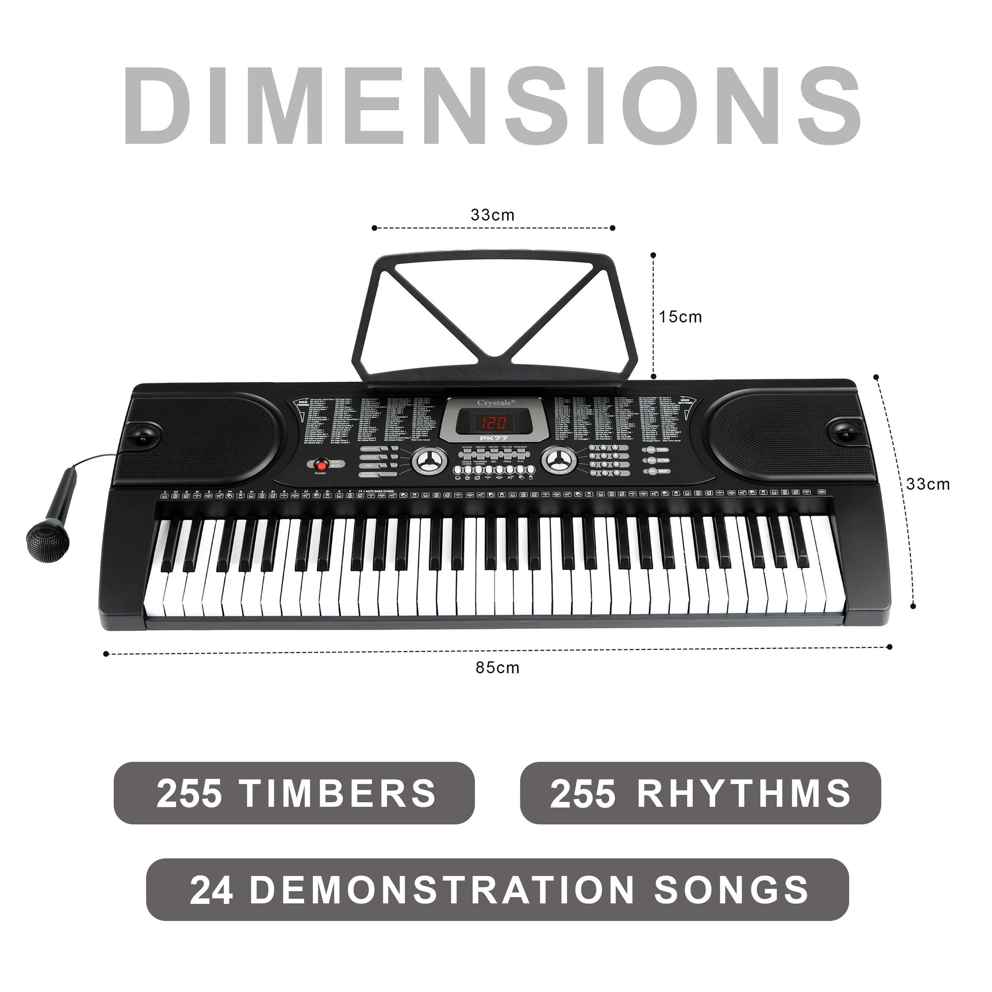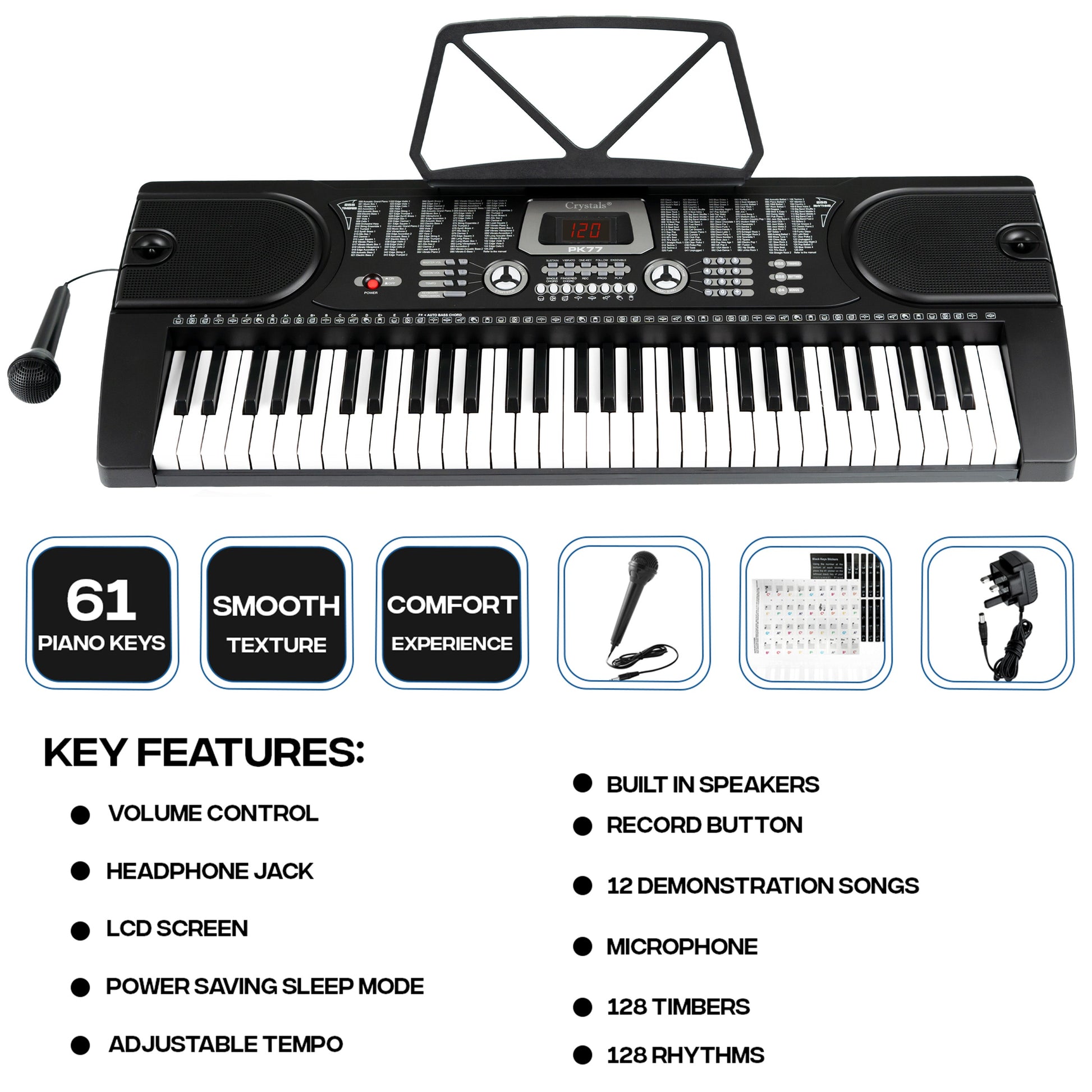 - 12 DEMONSTRATION SONGS / 128 TIMBERS / 128 RHYTHMS - Play along with a choice of 12 demonstration songs, up to 128 timbers change the sound of the keyboard keys and sync your music to 128 rhythms such as 'pop', 'jazz' and 'reggae' or programmed up to 32 of your own rhythms
