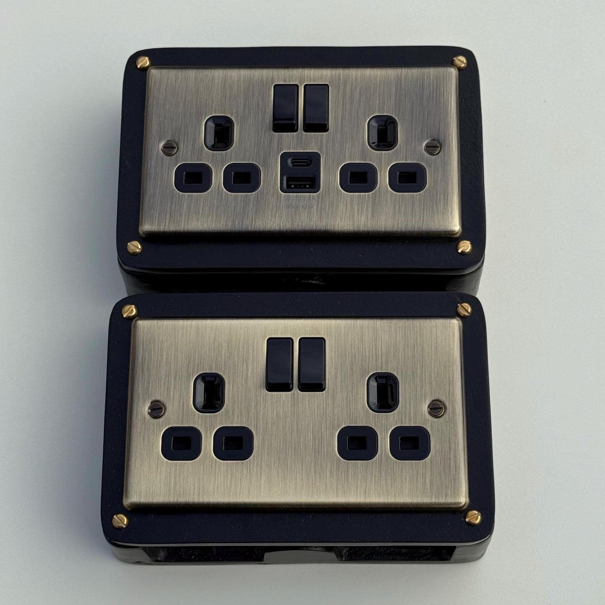 Antique Brass Double Gang Plug Socket with Industrial Black Cast Back Conduit Box