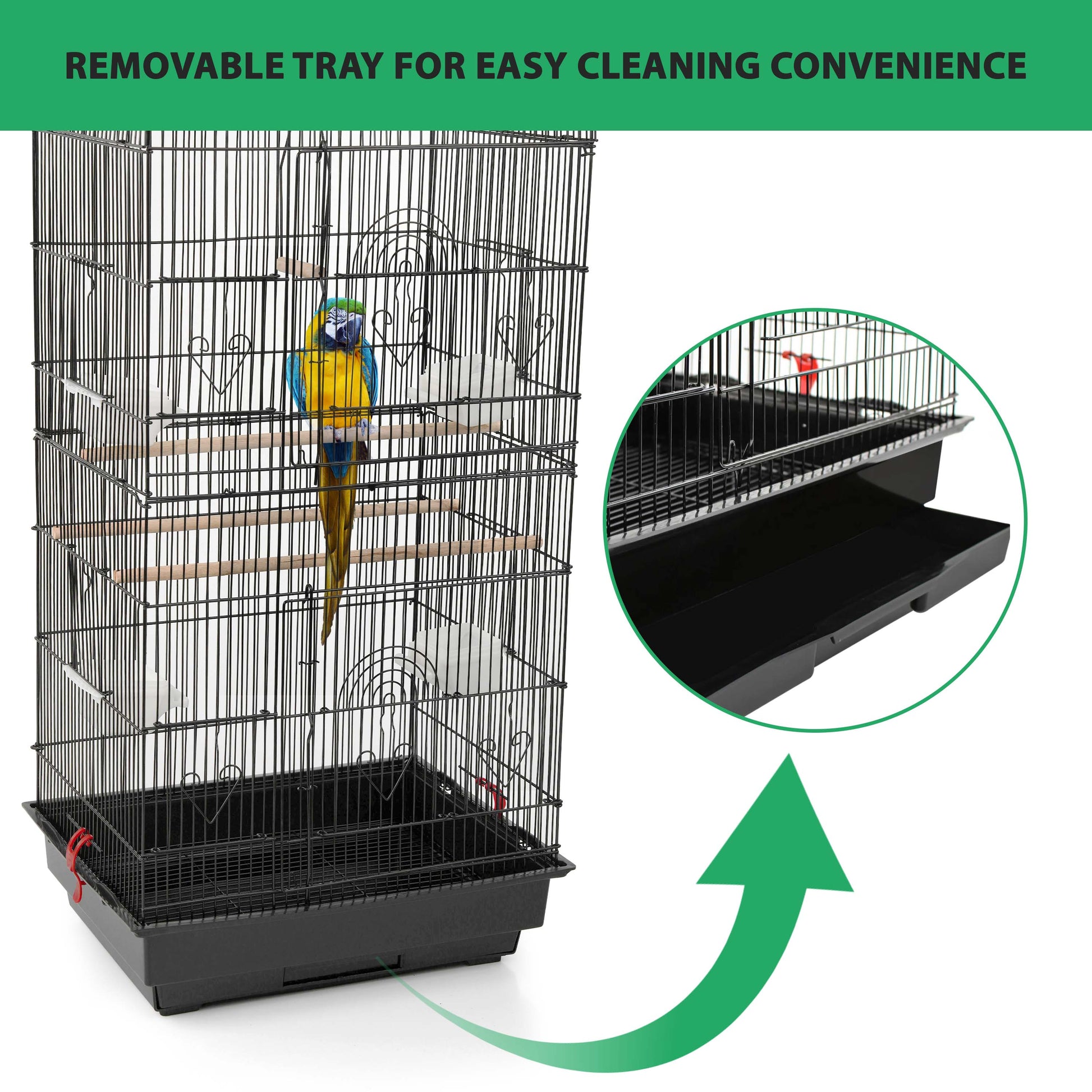 Treat your pet bird to a lovely new home. This wire birdcage offers a tall spacious enclosure for your pet birds. Can house a wide range of small birds. It is especially suitable for Budgies, Cockatiels, Parakeets, Canaries, Finches, Diamond doves, Goldie’s Lorikeet, and Conures to name but a few. Has been built with safety in mind, to offer your pets a secure and pleasant environment. It has an easy litter tray that slides out for easy cleaning. Pet birds that get enough mental stimulation are happier and less anxious, and our cage has a number of features that help with this: Large doors that make it easy to swap toys and play with your birds, a handle to easily move the cage, and one swing is included along with three wooden perches.