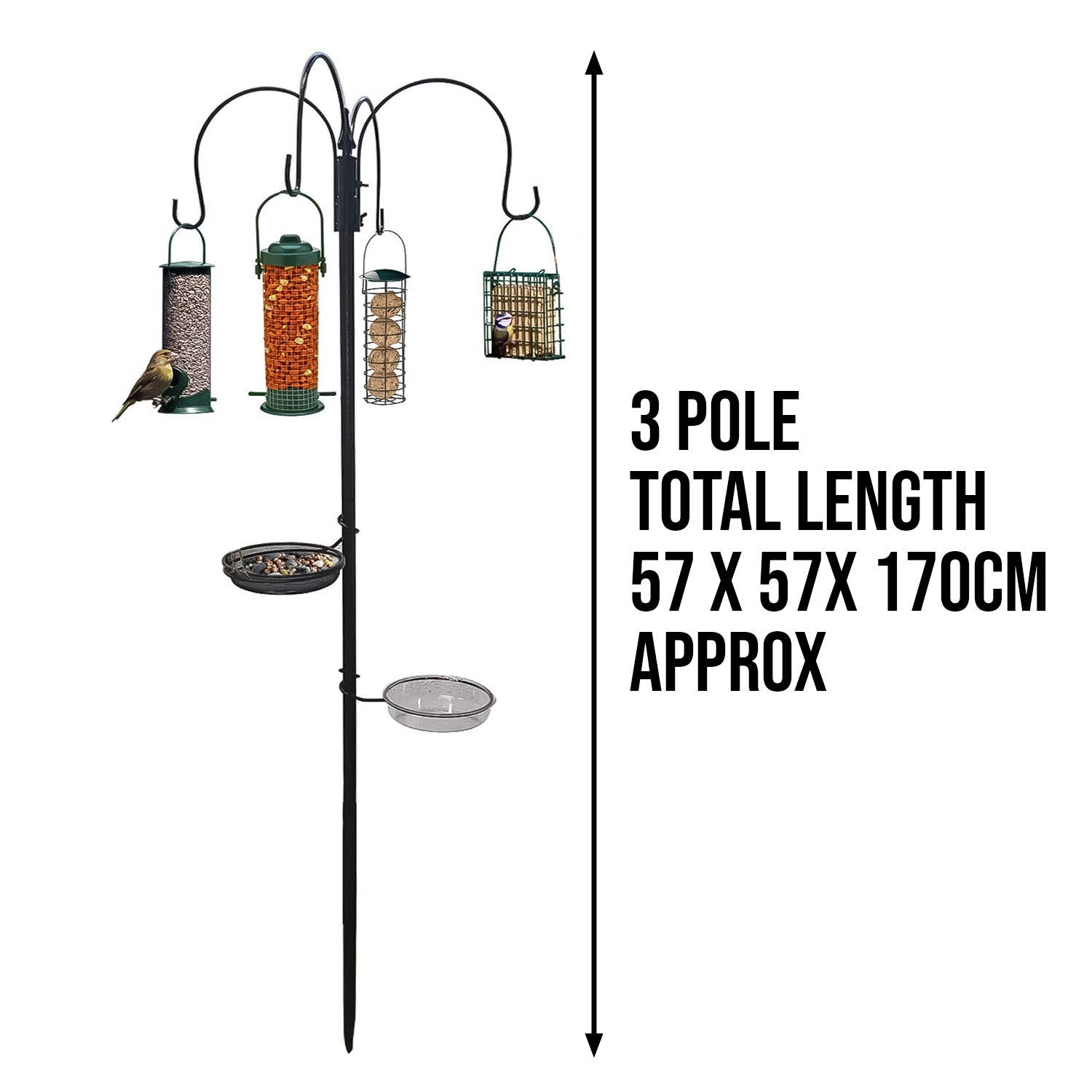 This is the Grey Hammertone Finish high-quality wild bird feeding station with feeders. The Bird Feeding Station provides an all-in-one feeding, watering and bathing solution for garden birds and will help to attract a wide variety of birds to your garden. Available in 2 different sizes. Pack Content 4x Poles bird feeding station, 2x Double Bracket, 1x Removable Mesh Tray with Wrap around the bracket, 1x Removable Water Dish with wrap around the bracket, 1x Seed Feeder, 1x Nut Feeder, 1x Fat Ball Feeder, 1x Suet Block Feeder.