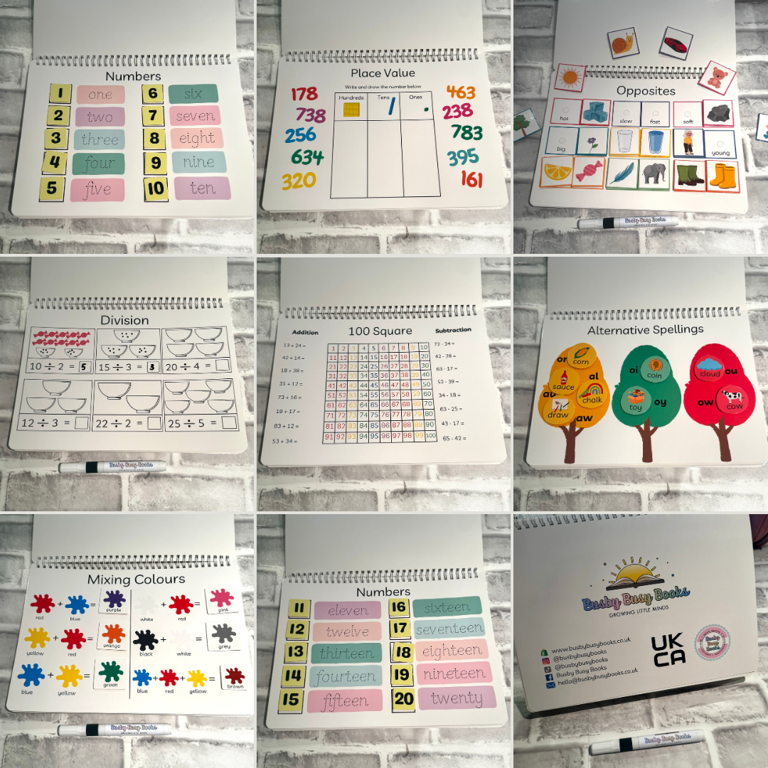 The book is held together with a spiral binder and all of the pieces are attached with velcro dots. They also come with a dry wipe marker. They are UKCA tested.