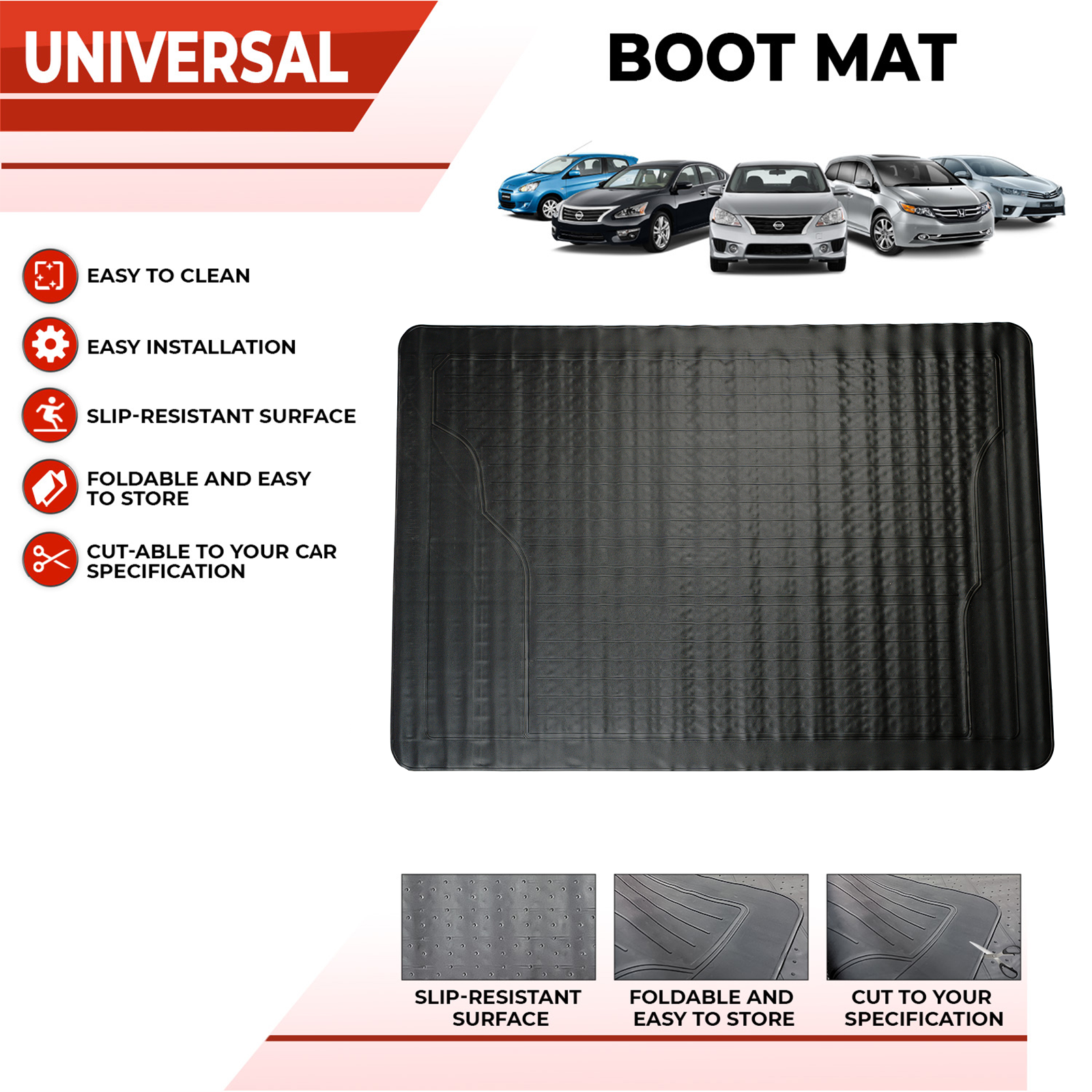This universal vehicle car boot mat can be adapted to fit a wide range of vehicles. Cut it to your own car boot space specifications. Universal fit car boot mats are made from hard-wearing rubber material and this mat will stand up to the day to day rigours that comes with items being moved in and out of the boot. Don't let your vehicle's upholstery become damaged, soiled, or faded in the UV light. This universal car boot mat is the perfect solution to keep your boot in the best condition possible.