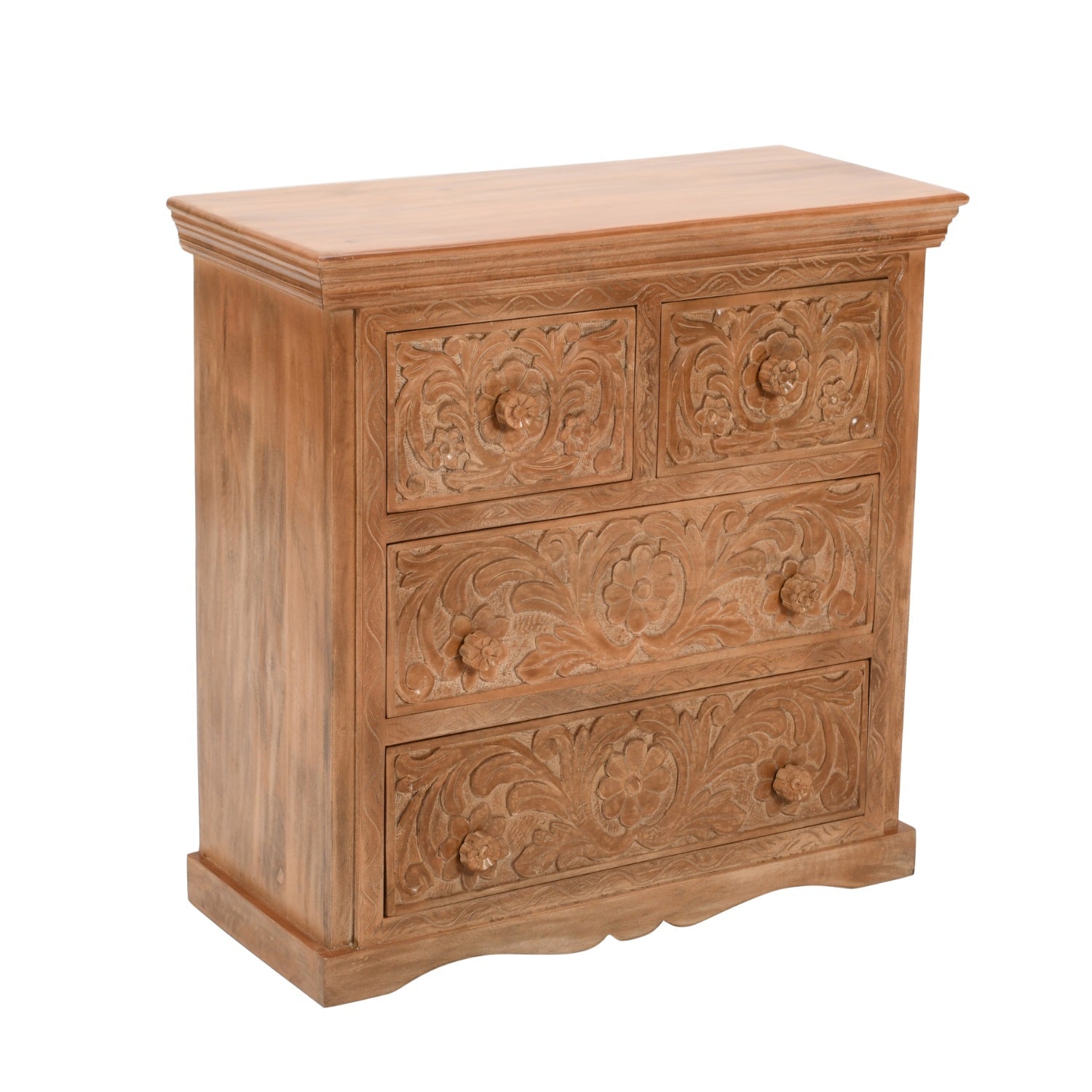 The warm and inviting tone of the mango wood adds a cosy feel to your bedroom or living room, while the carved detailing and elegant handwork adds a touch of elegance. The chest of drawers is both sturdy and durable, ensuring that it will last for years to come.