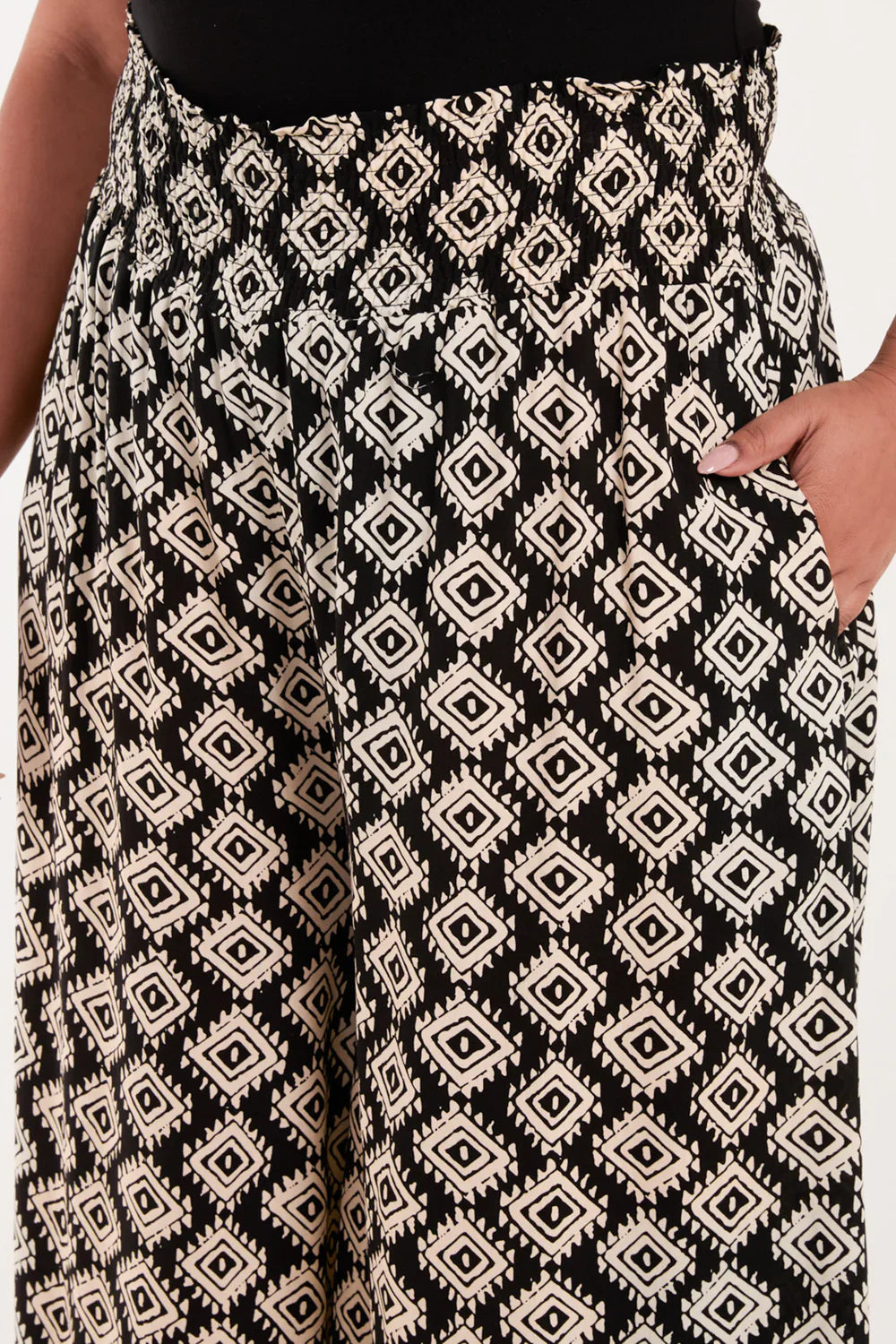 Step into effortless summer style with these curve-friendly wide leg trousers. Featuring a striking geometric print and a comfortable shirred waistband, they’re designed to flatter while keeping you cool. Pair with sandals and a simple tee for daytime chic, or dress them up with wedges and statement jewellery for evening.