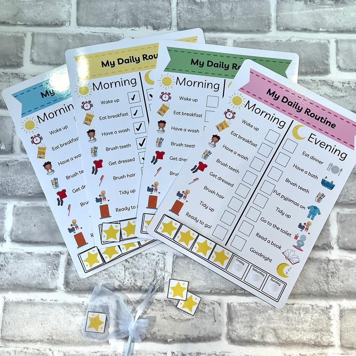 This dally routine chart is a great way to remind your child of their morning and evening jobs. You can tick them off with a drywipe pen (sold separately) and if they complete their day they get a star at the bottom of the chart for that day.