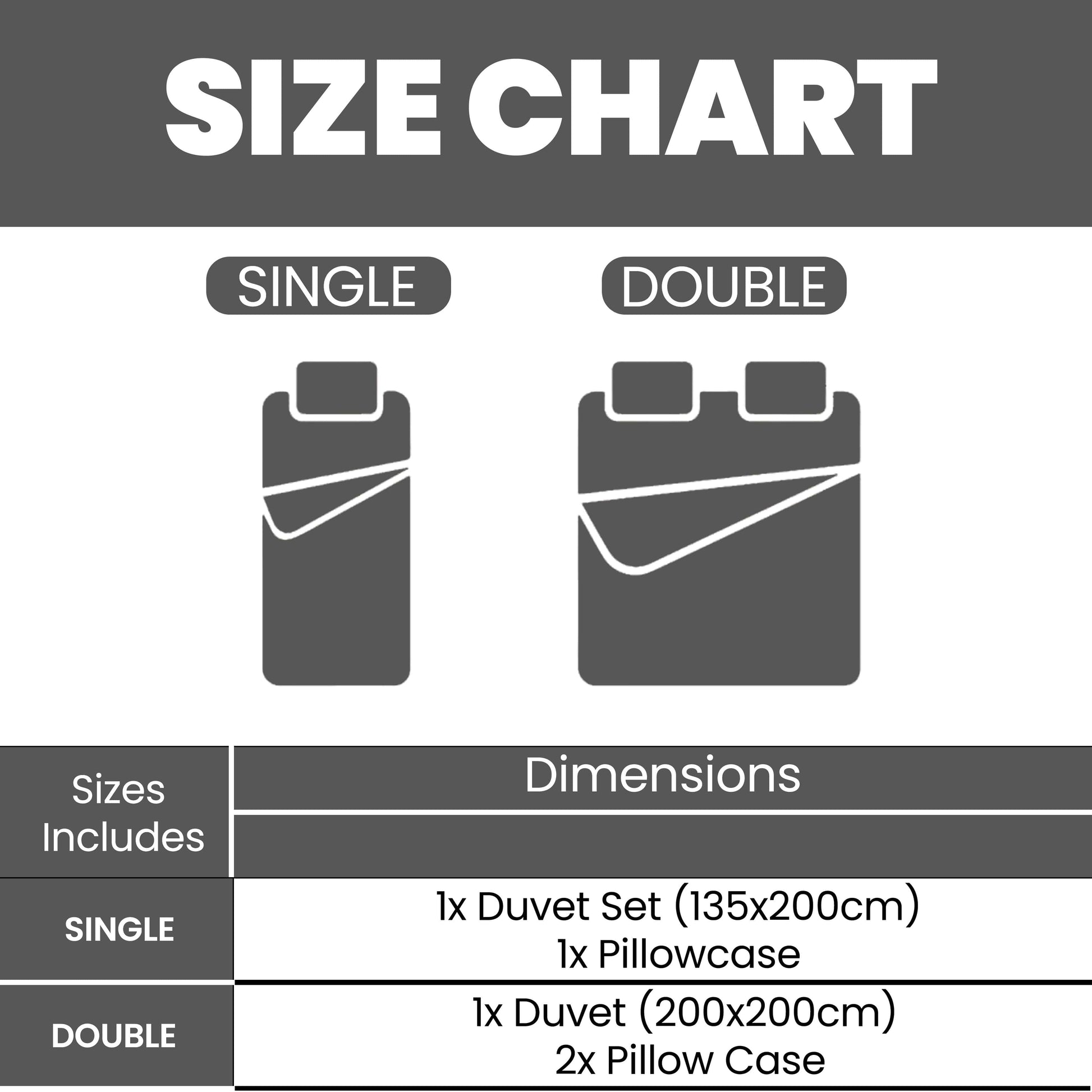 Single Duvet Set: 1x Duvet Covet set (135cmx200cm) + 1x Pillowcase