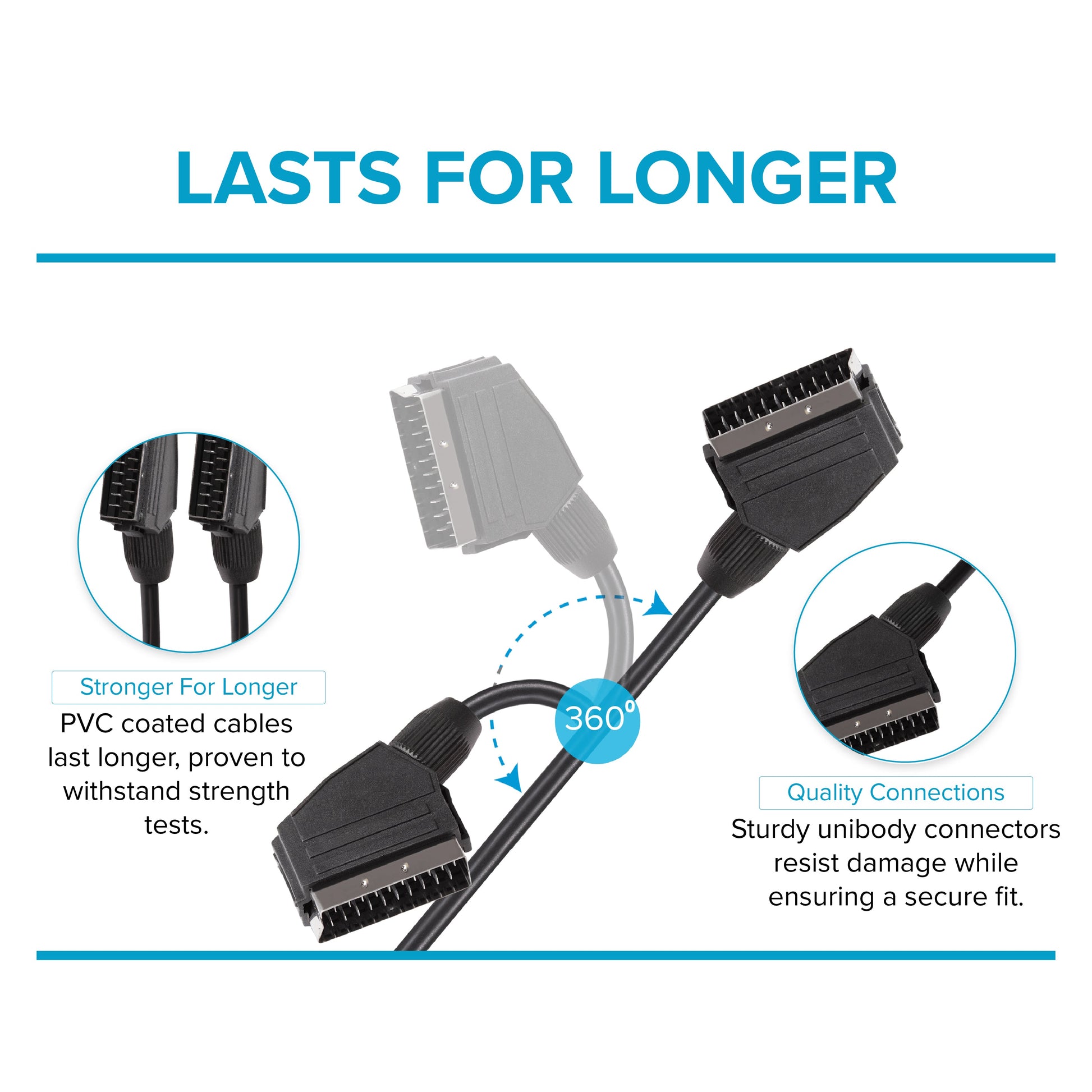 This SCART cable is ideal for use with connecting standard definition TVs to satellite boxes, DVD players and games consoles. SCART cables can carry component video, RGB video or composite video alongside a stereo audio signal.
