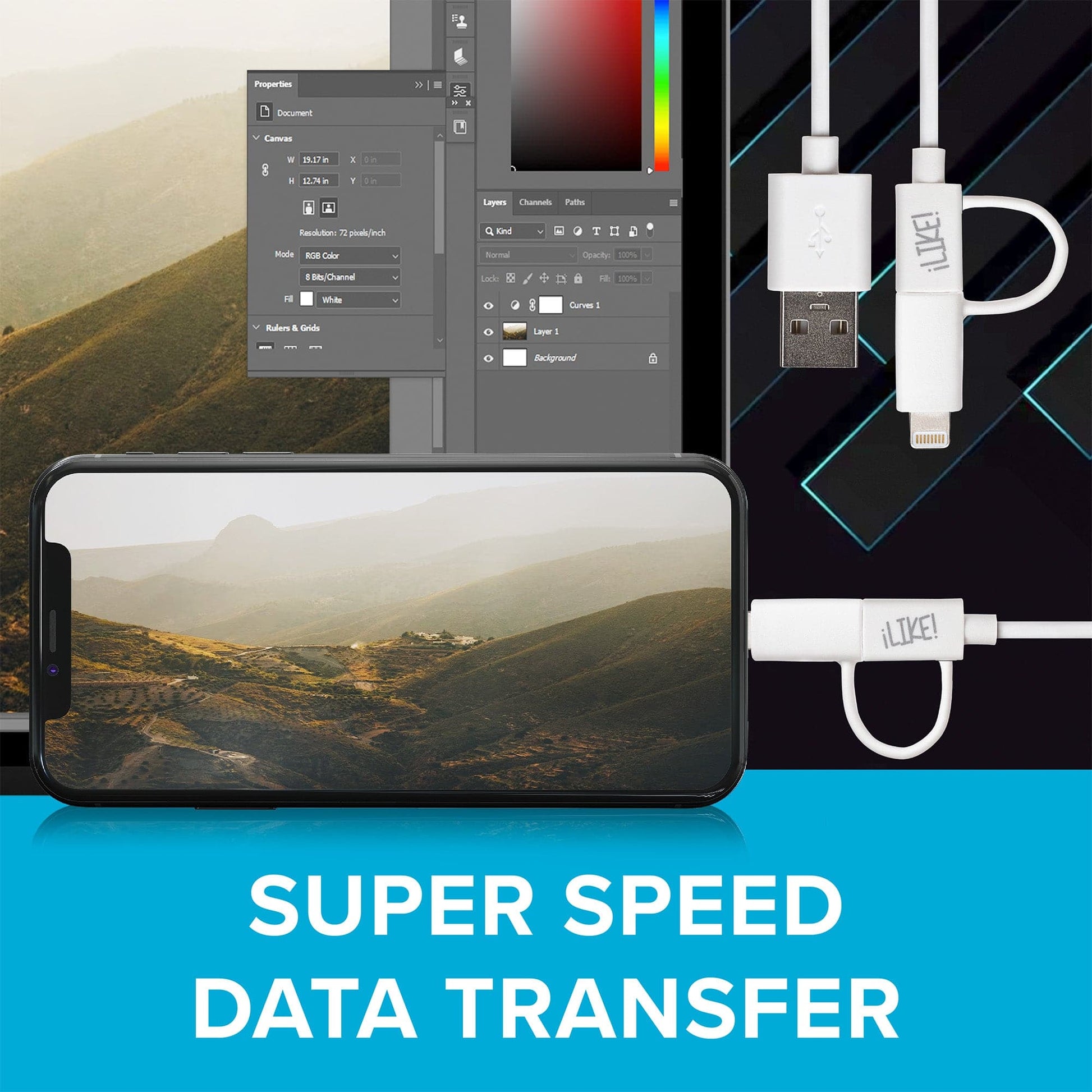 This extremely versatile Maplin USB-A to 2-in-1 Multi-Charging Lightning & Micro USB-B Cable has changeable connections, so you can use it for charging or data transfer. It is designed for use with Apple Lightning or micro USB devices – which would typically be portable devices such as smartphones or tablets. The Lightning connector is attached to the micro USB, meaning this cable can only be used with one device at a time.