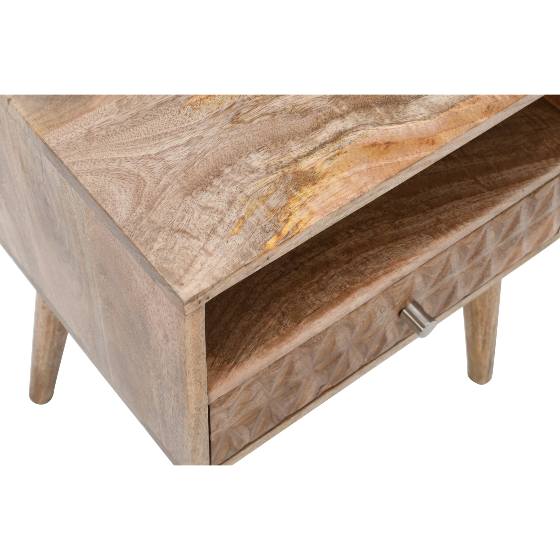 Bring effortless style and utility to your bedroom with the Handmade Marlow Light Mango Wood Bedside Table with 1 Drawer & Open Slot. Expertly crafted from premium-quality mango wood, this bedside table offers lasting durability and a natural charm that enhances any decor. Its distinctive wood grain patterns add a touch of character to your room, making it a unique and functional piece.
