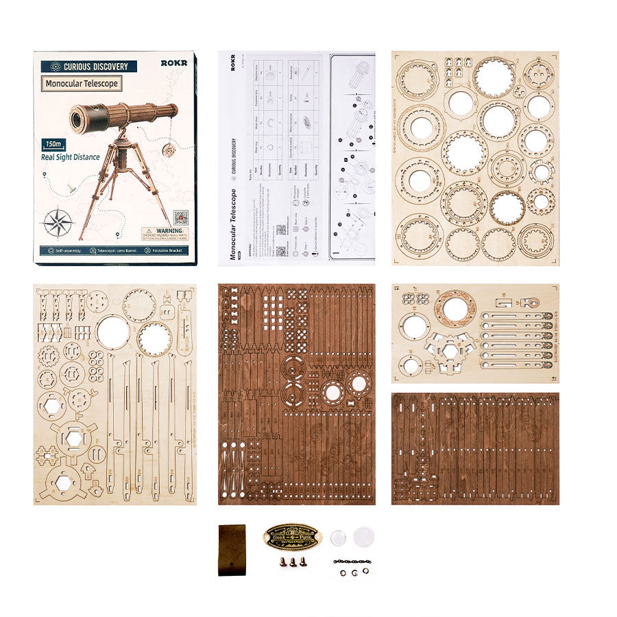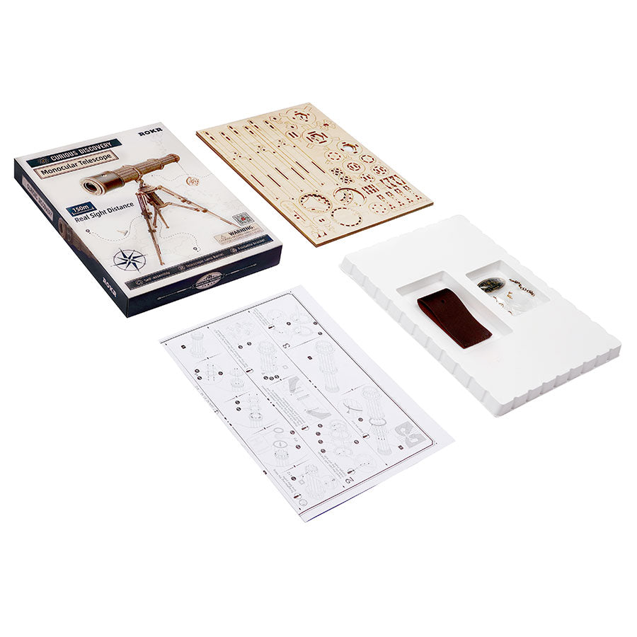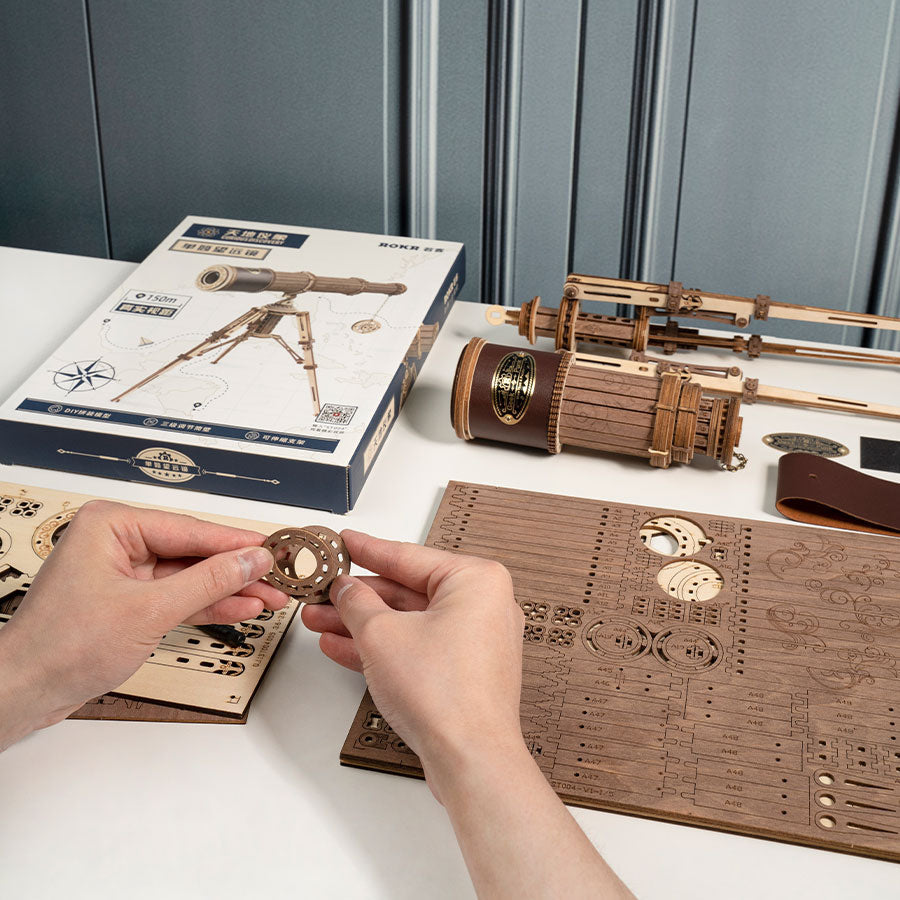 Robotime-ROKR Monocular telescope ST004 is a classic-style telescope model 3D wooden puzzle. This ROKR puzzle is designed with decorative leather & retro metal nameplate, adjustable tripod, telescope lens barrel. The real sight distance is 150M (500ft). Building it with your own hands will be an experience for navigators and adventure lovers.