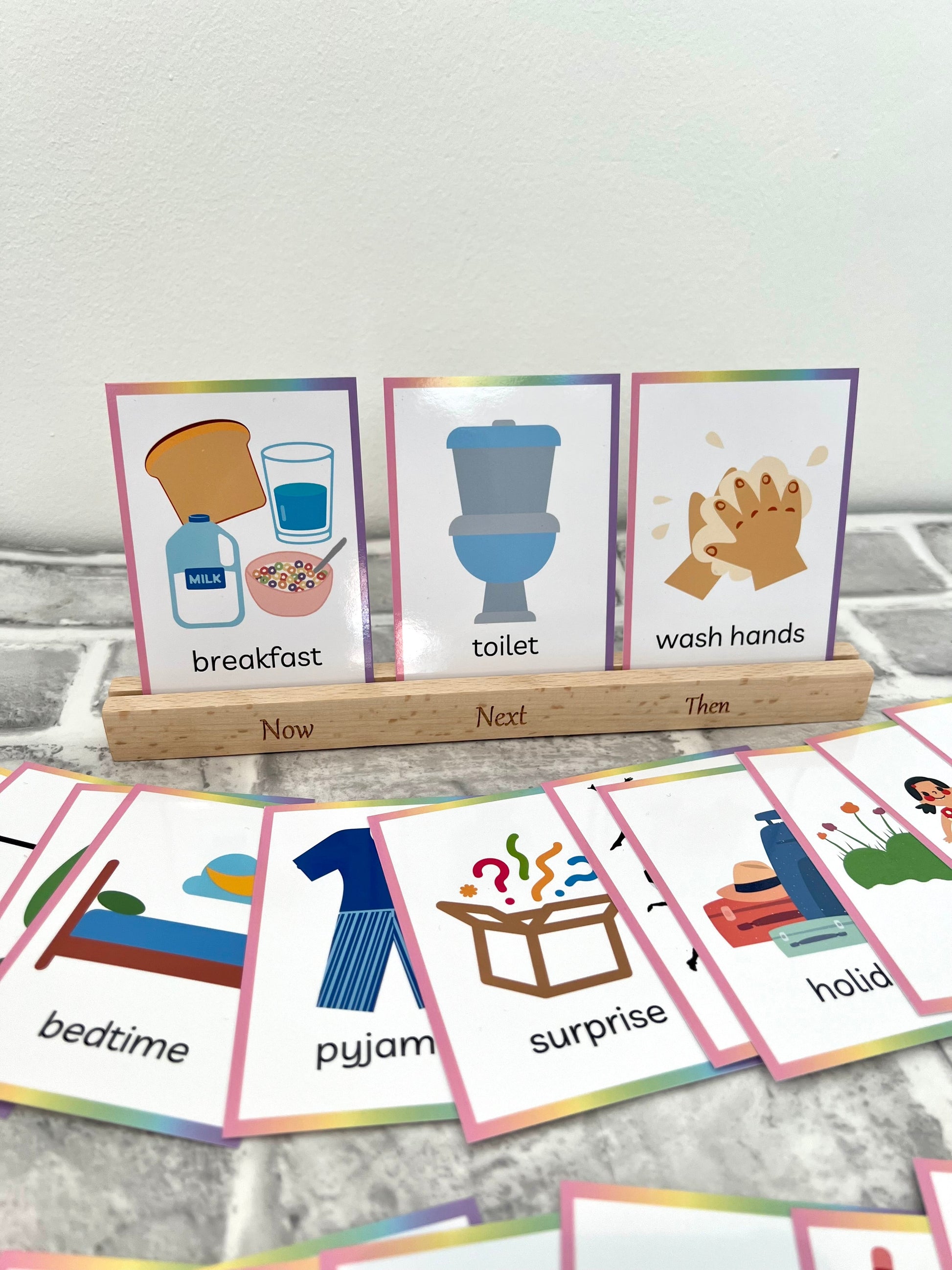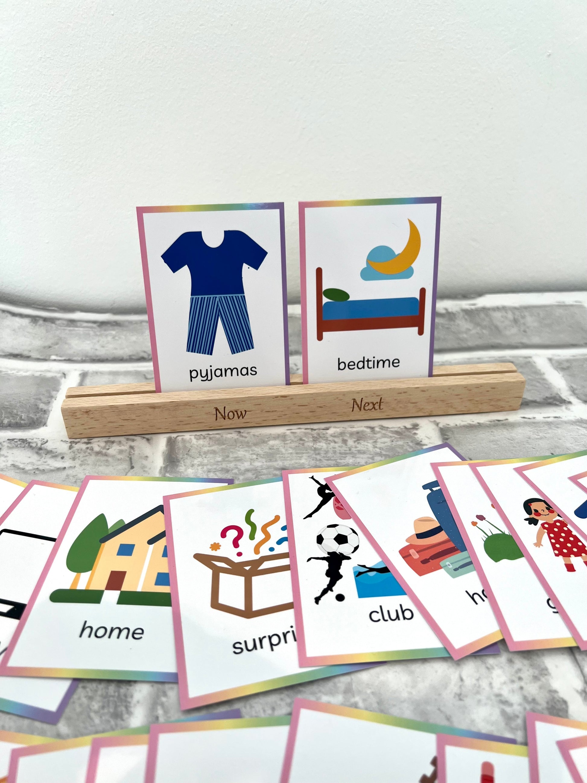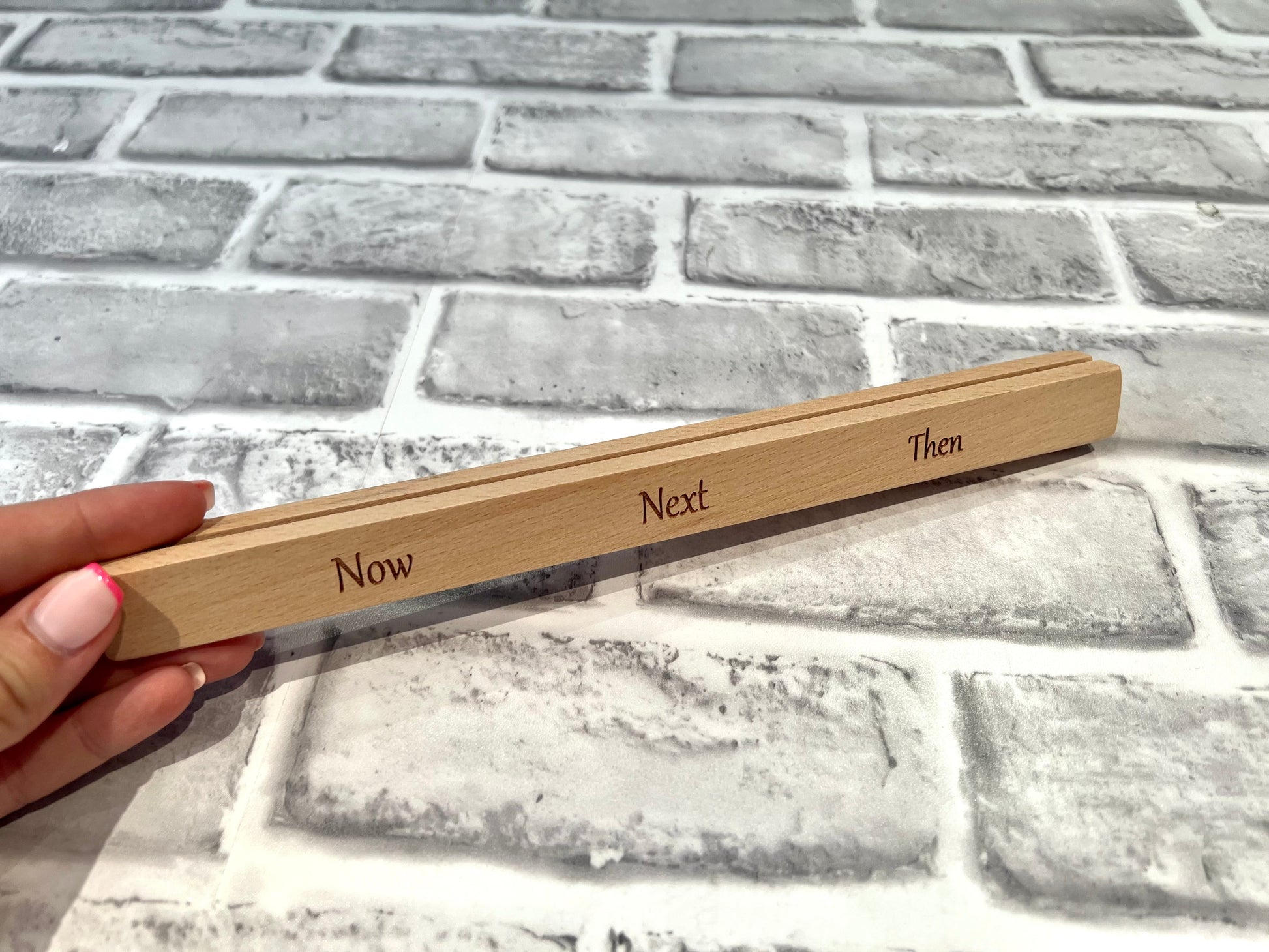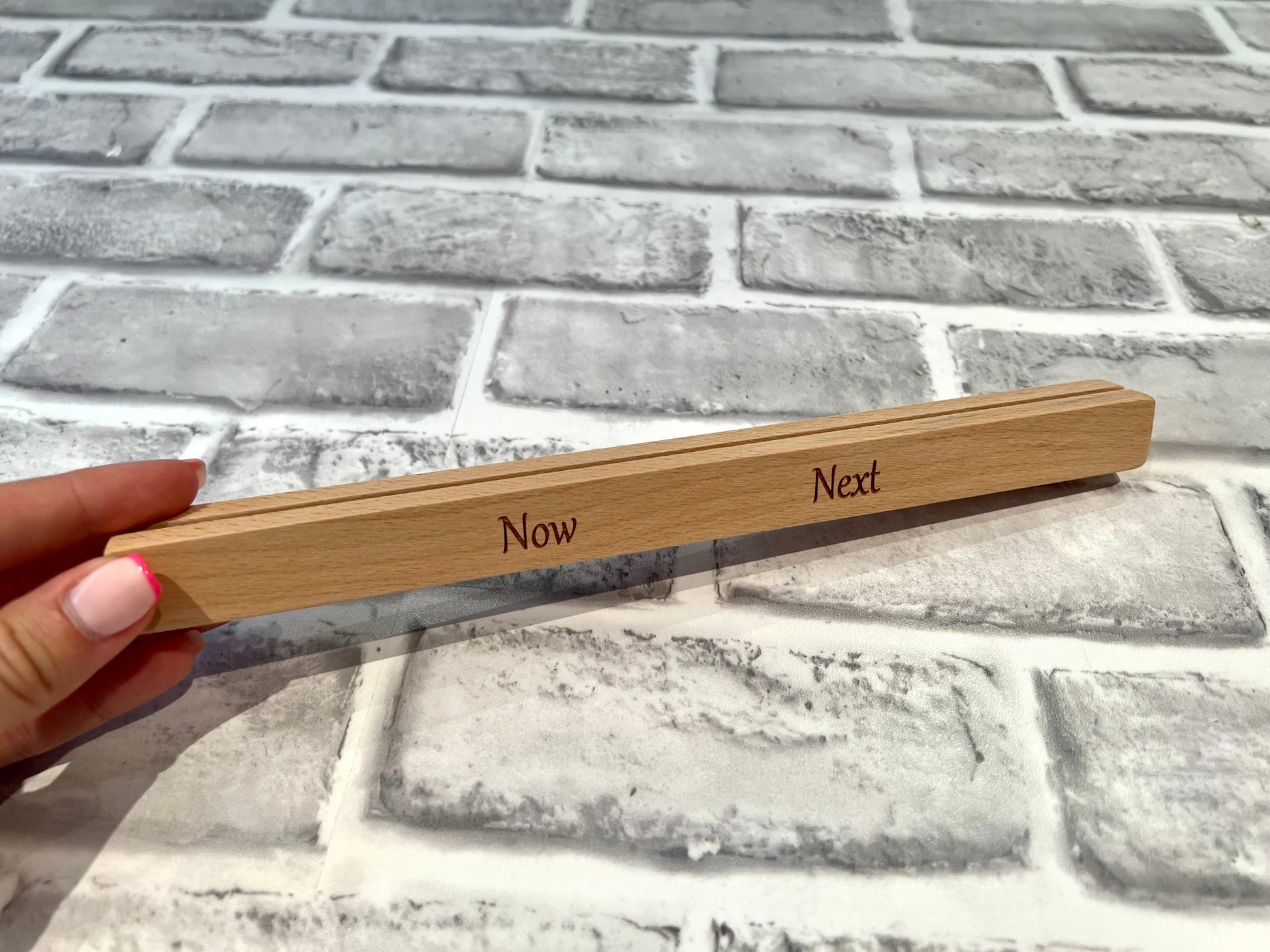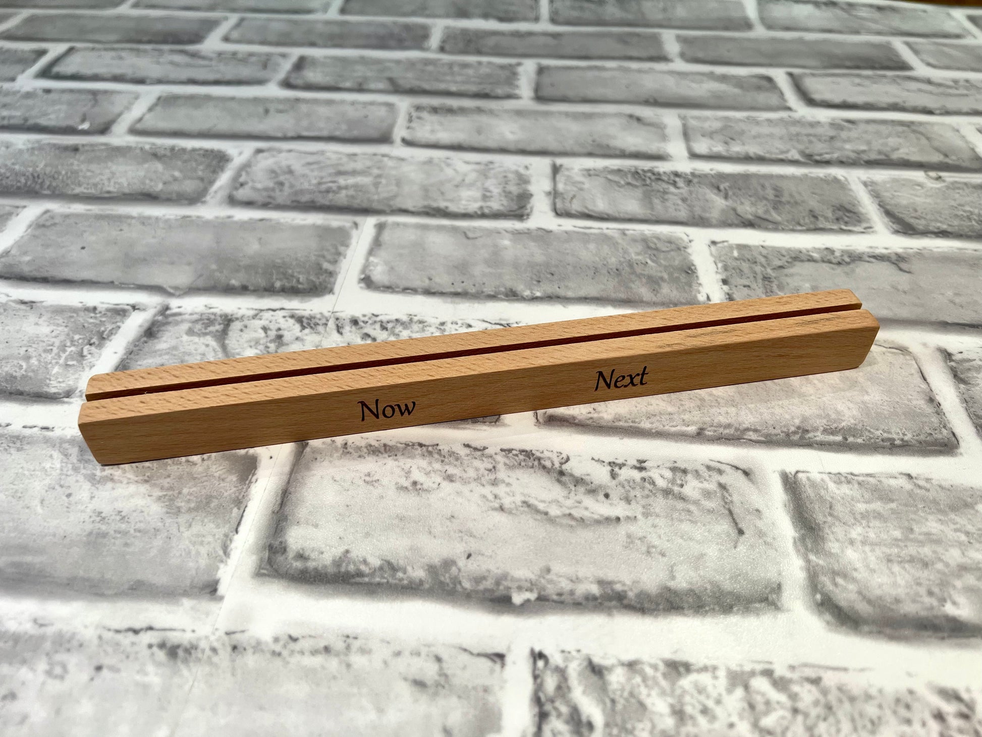 A Wooden stand to hold your cards in place - 1 side says now and next and 1 side says now next and then