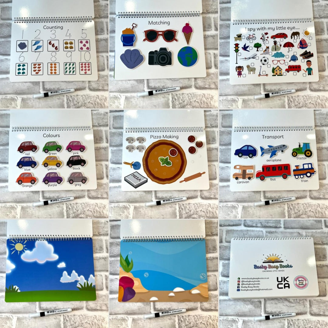 The book is held together with a spiral bind and all of the pieces are attached with velcro dots. They also come with a dry wipe marker.
