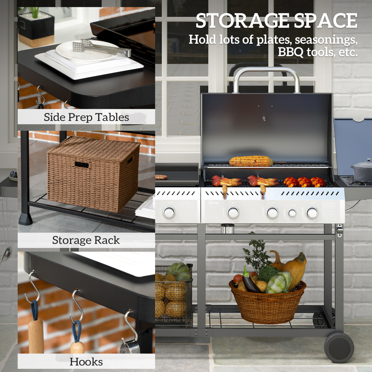 ● Weight Capacity: (grill grate) 10 kg, (bottom shelf) 20 kg, (side shelf) 5 kg