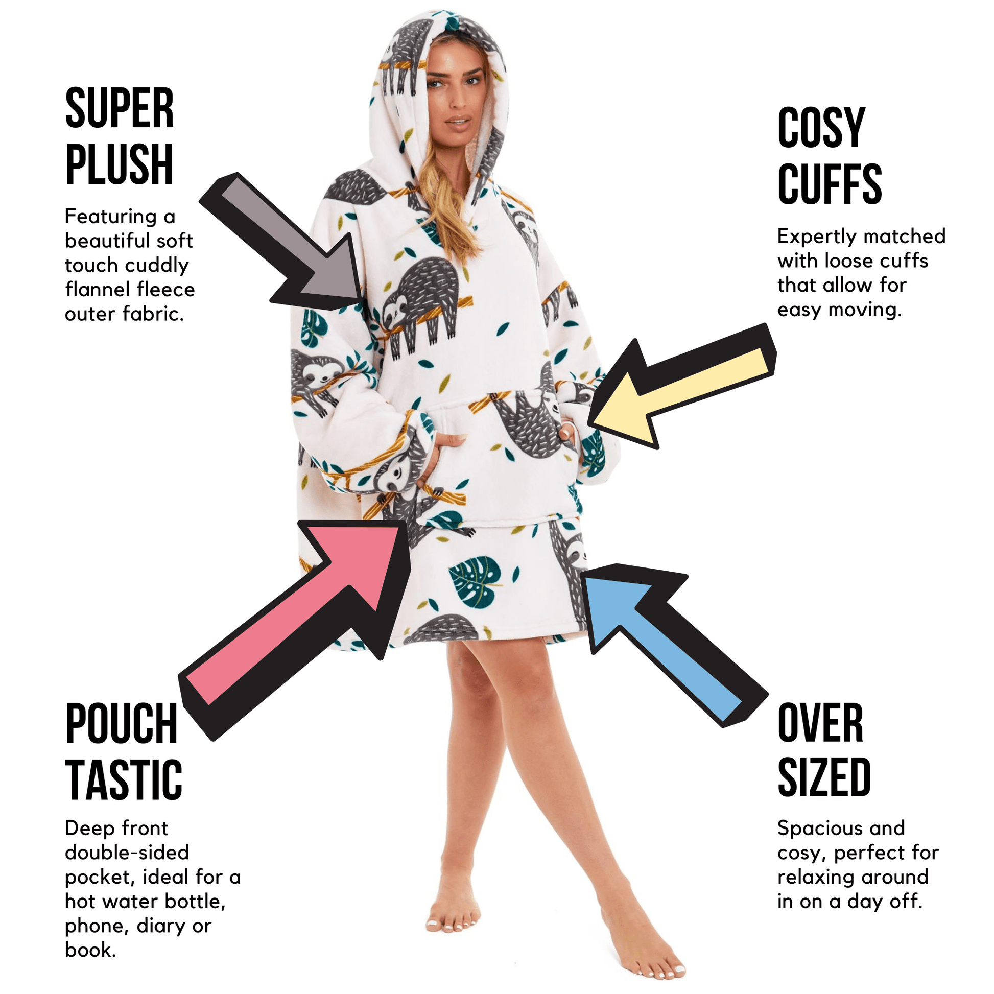 Oversized Sloth Hoodie Blanket with Reversible Sherpa Plush Fleece Giant 6XL for Adults and Kids with Pockets and Elastic Cuffs by Daisy Dreamer