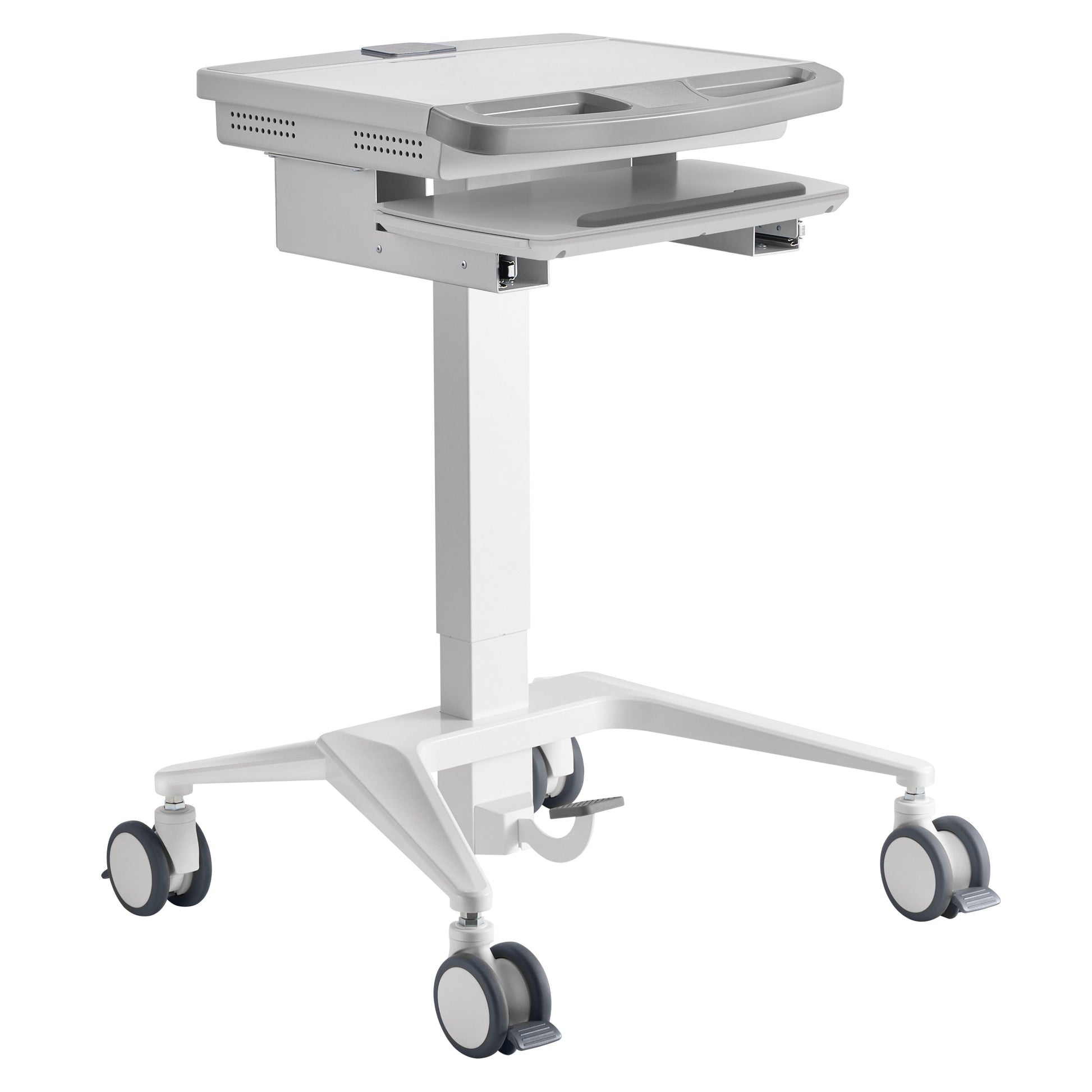 The pneumatic foot-pedal lift system allows smooth height adjustment between 800mm and 1150mm, enabling effortless transitions between sitting and standing positions. Four locking caster wheels offer maximum mobility when moving between rooms and stability when stationary, making it ideal for multi-user or shift-based environments. The keyboard tray is included with a retractable mouse tray for easy typing.