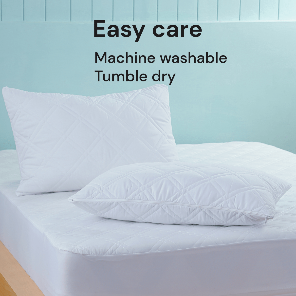 Extend the life of your pillows and enjoy a touch of added luxury with our White Quilted Pillow Protectors. Crafted from 100% brushed microfibre, these protectors offer a soft, plush feel for enhanced comfort and restful sleep. The elegant white finish delivers a clean, classic look that fits effortlessly with any bedding style. Designed with a quilted surface, they provide an extra layer of cushioning while protecting your pillows from dust, sweat, and allergens.
