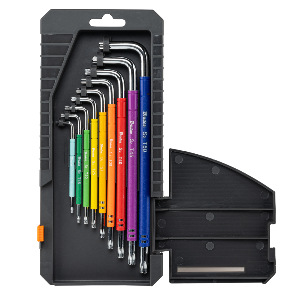 The set includes the following TORX key sizes and colours: TX10 in light blue, TX15 in dark green, TX20 in light green, TX25 in yellow, TX27 in dark yellow, TX30 in orange, TX40 in red, TX45 in purple, and TX50 in dark blue. With a full range of sizes, this versatile set is a reliable addition to any toolkit.