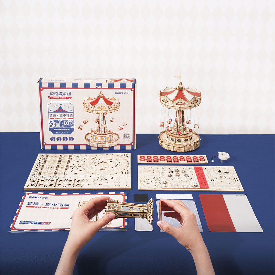 Robotime-ROKR Swing Ride DIY music box is a creative and fun-to-play wooden 3D puzzle kit of Magic Amusement Park Series. Its design is inspired by the swing ride in the amusement park. With built-in movement, the seats will be suspended from the rotating top of the carousel with music and lights on by simply touching the button. Build this exquisite 3D wooden puzzle with your hands and enjoy the ride!