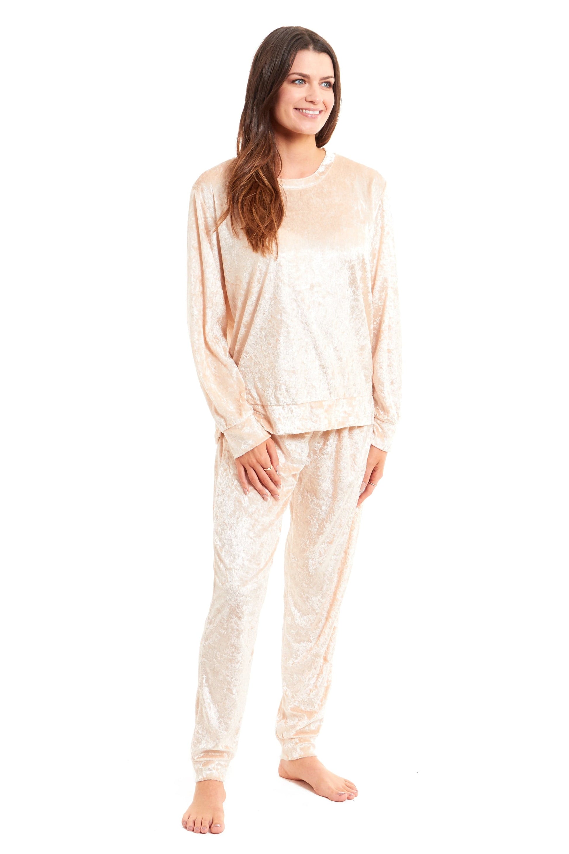 Description: The Women's Crushed Velvet Pyjama Set includes both a top and pants, making it a complete loungewear solution. The matching set offers a coordinated look that’s both stylish and practical.